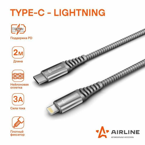 Зарядный датакабель AIRLINE Type C для Iphone/IPad Поддержка PD нейлон. оплётка ACH IPD 26