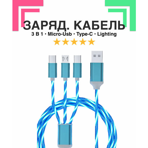 Зарядный кабель светящийся 3 в 1, Зарядный кабель с подсветкой и 3 разъемами MicroUSB, Type-C, Lightning, 120см, цветной