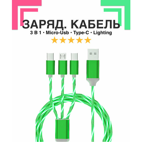 Зарядный кабель светящийся 3 в 1, Зарядный кабель с подсветкой и 3 разъемами MicroUSB, Type-C, Lightning, 120см, Зеленый