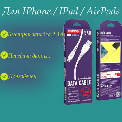 Кабель для айфона зарядка + передача данных 8pin lightning usb 2,4 А, 1 метр