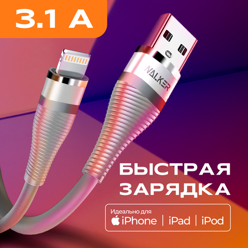 Кабель для зарядки WALKER C735, С БЫСТРЫМ ЗАРЯДОМ 3.1 А в силиконовой оплетке, разъём Lightning, серый, 1 метр, шнур usb питания для телефона айфона