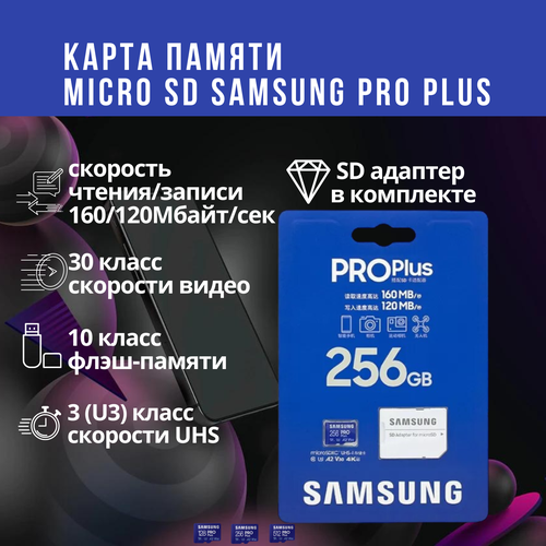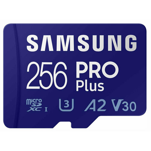 Карта памяти Samsung SDI Pro Plus microSDXC 256 ГБ Class 10, V30, A2, UHS-I U3, R 180 МБ/с, адаптер на SD