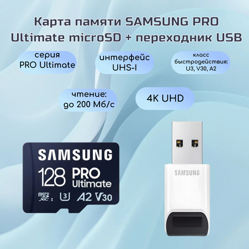 Карта памяти Samsung Pro Ultimate microSDXC 128GB Class 10, V30, A2, UHS-I U3, R 200 МБ/с, с переходником на USB