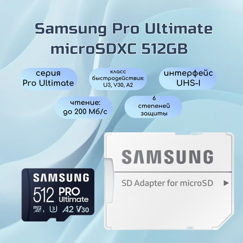 Карта памяти Samsung Pro Ultimate microSDXC 512GB Class 10, V30, A2, UHS-I U3, R 200 МБ/с, адаптер на SD