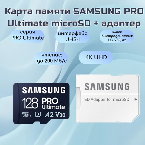 Карта памяти Samsung Pro Ultimate microSDXC 128GB Class 10, V30, A2, UHS-I U3, R 200 МБ/с, адаптер на SD