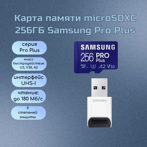 Карта памяти Samsung Pro Plus microSDXC 256 GB Class 10, V30, A2, UHS-I U3, R 180 МБ/с, с переходником на USB