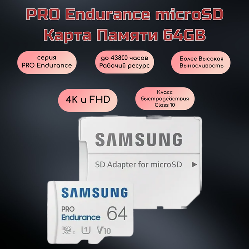 Карта памяти Samsung Pro Endurance microSDXC 64 GB, адаптер на SD