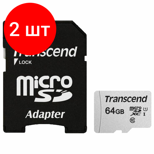 Комплект 2 шт, Карта памяти microSDXC 64 GB TRANSCEND UHS-I U1, 95 Мб/сек (class 10), адаптер, TS64GUSD300S-A