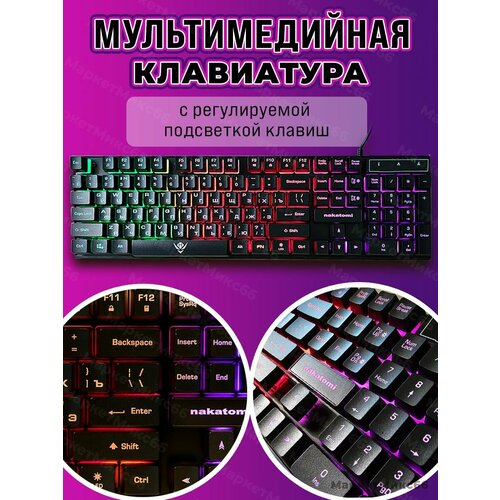 черныйNakatomi KG-23U black - стильная черная игровая клавиатура с регулируемой яркостью, многоцветной RGB подсветкой клавиш и дополнительными мультимедийными функциями. Компьютерная клавиатура для ПК оснащена тонким основанием с полностью открытыми клавишами и направляющими клавиш. Клавиши длинноходные, рабочий ход клавиши от 3 до 5 мм. Мембранная клавиатура с подсветкой - это девайс с комфортным ходом клавиш и регулируемым углом наклона в соответствии с индивидуальными потребностями пользователя. Механическая клавиатура, в отличие от нашей мембранной, отличается шумным нажатий клавиш, поэтому наша проводная клавиатура может использоваться как дома, так и на работе. Офисная клавиатура для ПК снабжена передними резиновыми ножками, надежно фиксирующими её на рабочем столе. Мультимедийная клавиатура для компьютера имеет статичную RGB подсветку с регулируемой яркостью, которая позволит сделать ее использование еще удобней. Яркая многоцветная подсветка обеспечивает комфорт управления игровым процессом в любое время сут