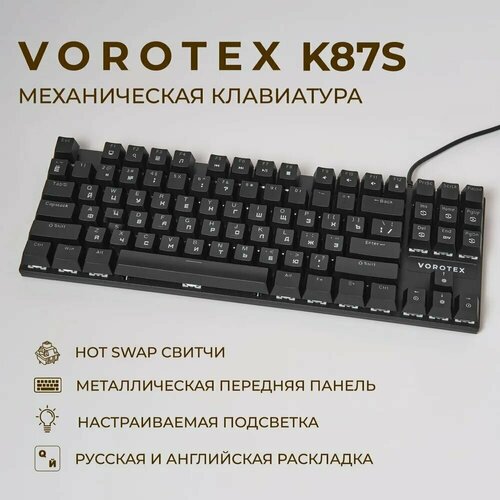 черный, серый, черныйКачественная механическая проводная клавиатура VOROTEX K87S с английской и русской раскладкой. Имеет компактные размеры за счет отсутствия дополнительного цифрового блока, что позволяет комфортно организовать рабочее пространство.