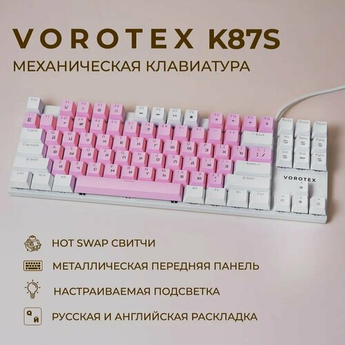 Клавиатура VOROTEX K87S Red Switch, белый/розовый, английская/русская (ANSI)