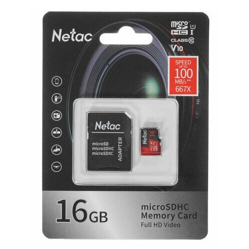 Карта памяти Netac microSDHC 16 ГБ Class 10, V10, A1, UHS-I U1, R 100 МБ/с, адаптер на SD, 1 шт., черный/красный
