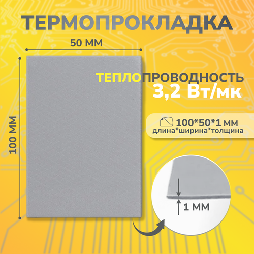 Термопрокладка теплопроводящая, термо подложка 3kS, 3,2 Вт/мK, 50х100мм, толщина 1,0мм (сер.)