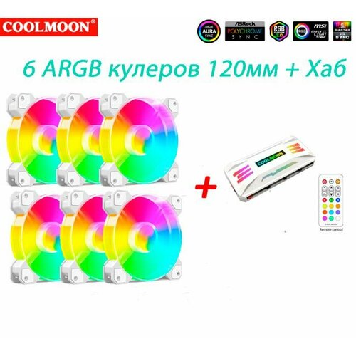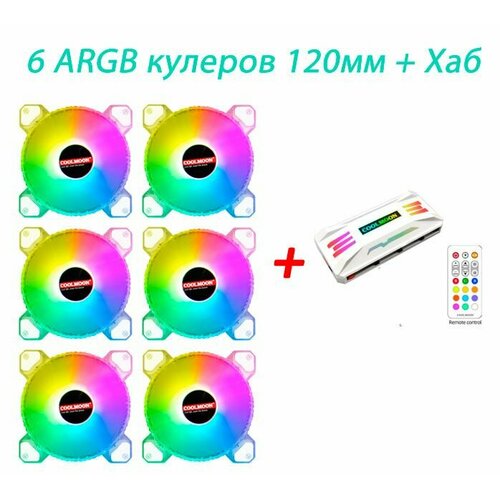 Комплект 6 ARGB кулеров 120мм + Хаб с пультом ДУ Coolmoon