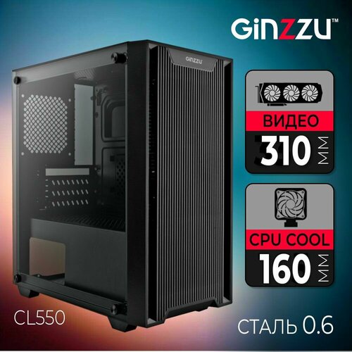 Корпус для ПК Ginzzu CL550 mATX закаленное стекло боковая панель, передняя панель решетка
