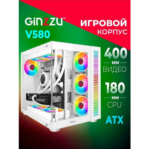Корпус Ginzzu V570 ATX кубик, закаленное стекло, RGB подсветка, система охлаждения CRC10 + 4 RGB вентилятора