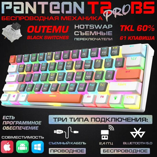 PANTEON T2 PRO BS Grey-White (73) Механическая игровая программируемая клавиатура (60%, подсветка LED RGB, свитчи Outemu Black, 61 кл, HotSwap, USB/Bluetooth/2,4 Ггц, аккумулятор 1450 mAh, ПО), цвет: серый-белый (73)