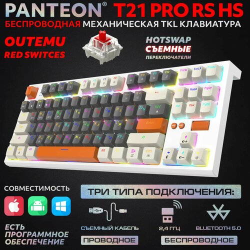 PANTEON T21 PRO RS HS White-Grey-Ivory (62) Механическая игровая программируемая клавиатура (TKL 80%, подсветка LED RGB, свитчи Outemu Red, 87 кл, HotSwap, USB/Bluetooth/2,4 Ггц, аккумулятор 2000 mAh, ПО)
