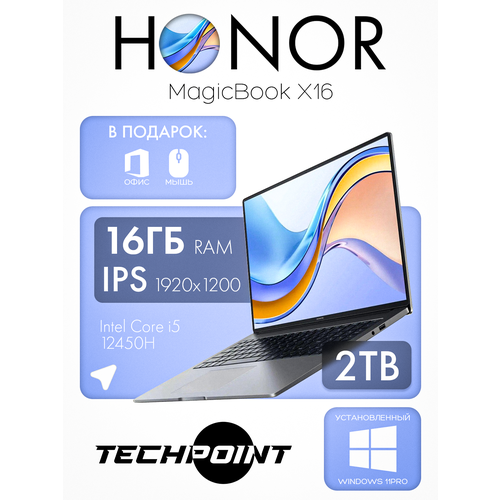 16" Ноутбук Honor MagicBook X16, BRN-F56 1920х1200, Intel Core i5-12450H (2.0 ГГц), RAM 16 ГБ, SSD 2000 ГБ, Windows 11 Pro + MS Office 2021 Pro, русская клавиатура, серый