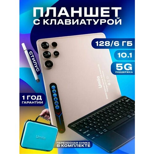 Планшет Umiio S24 Ultra с беспроводной клавиатурой в фирменном кейсе, 6/128 ГБ, Android 12, диагональ 10.1", золотой
