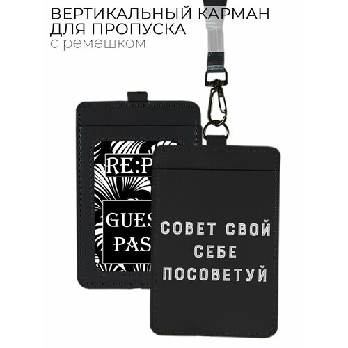 Чехол (бейдж) для пропуска и карт на ленте с принтом "Совет свой себе посоветуй!" черный