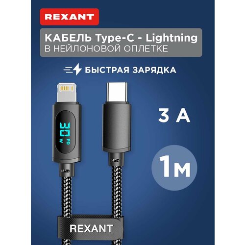Кабель Type-C – Lightning для Apple, 3А, 1м, в черной нейлоновой оплетке, с LED-дисплеем REXANT