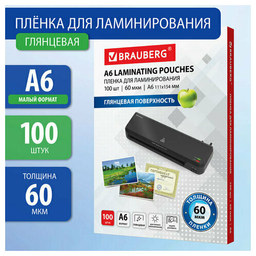 Комплект 5 шт, Пленки-заготовки для ламинирования малого формата, А6, комплект 100 шт, 60 мкм, BRAUBERG, 531784