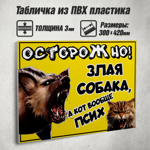 Информационная табличка "Исторожно! Злая собака, а кот вообще псих" / 42x30 см.