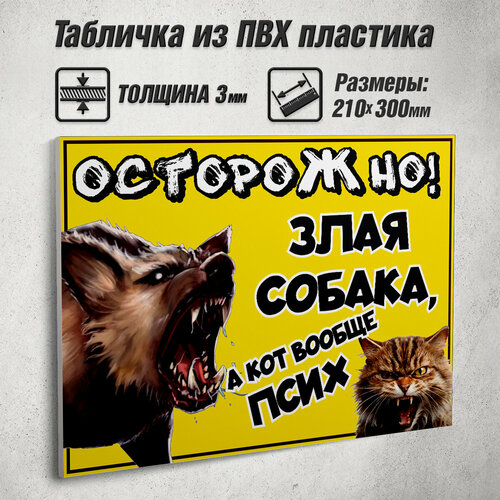 Информационная табличка "Исторожно! Злая собака, а кот вообще псих" / 30x21 см.