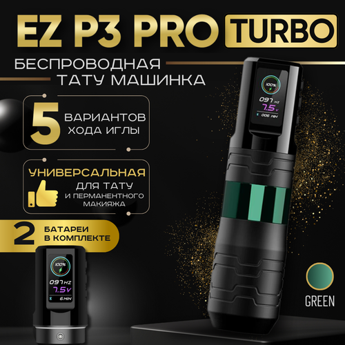 Беспроводная тату машинка EZ P3 Pro Turbo Green с регулируемым ходом иглы и двумя аккумуляторами, зеленая