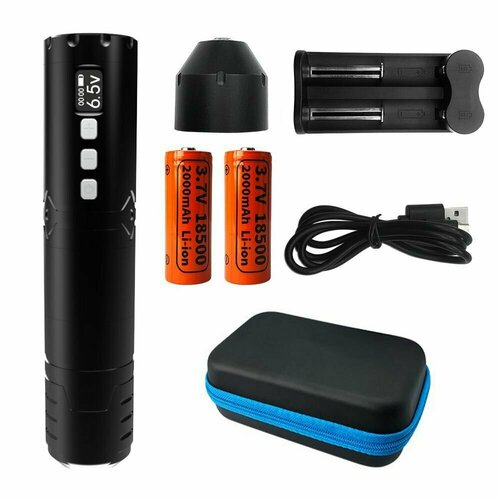 От батареи тату машинка может работать до 9 часов. Дисплей LCD с индикацией времени работы, рабочего напряжения и процента остатка заряда аккумулятора. Машинка отличается плавностью хода и мягкостью удара. Есть функция памяти напряжения на котором последний раз была произведена работа, при следующем включении машинка начнет работать на напряжении которые было выставлено при выключении. Встроенная система Jump-start 10V. на 0,02 сек. для помощи машинке при запуске с большими гру
