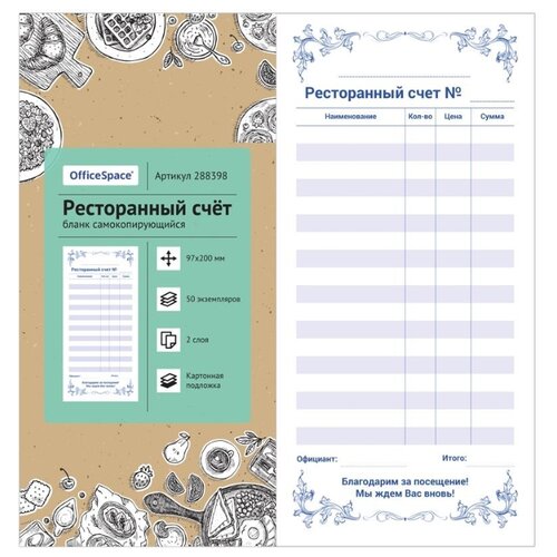 Бланк самокопирующийся "Ресторанный счет" 97*200мм,2-слойный, 50 экз., картонная обложка с подложкой, цена за штуку, 288398