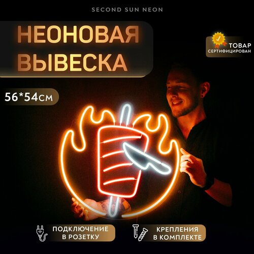 Неоновая табличка подключается в розетку и работает от 12 вольт, это делает её безопасной и энергосберегающей. Неоновая лента имеет срок службы 10 лет непрерывного яркого равномерного свечения без точек.