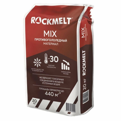 Преимущества:- Пролонгированное действие: материал сохраняет свои свойства на протяжении длительного времени, защищая поверхность от образования льда.- Расширенный рабочий диапазон: материал эффективен при температуре до -30°C, что делает его универсальным для использования в различных климатических условиях.- Безопасен для животных и растений: при соблюдении норм расхода, материал безопасен для окружающей среды и не наносит вреда живым организмам.- Эффективно разрушает ледяные образования: ROCKMELT эффективно разрушает снежно-ледяные отложения и долгое время препятствует образованию нового слоя льда.