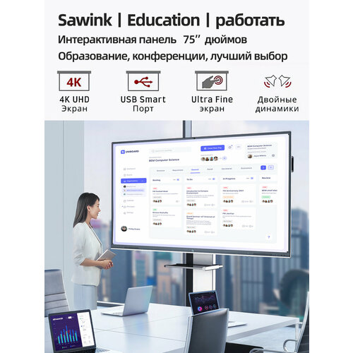 Интерактивная панель включает металлическую подставку Sawink, 75, 4К (3840*2160), 350 кд/м2, 4000:1, IR, 8 мс, 20 касаний, VESA 400x600, Wi-Fi, Android 11.0 [75B20]