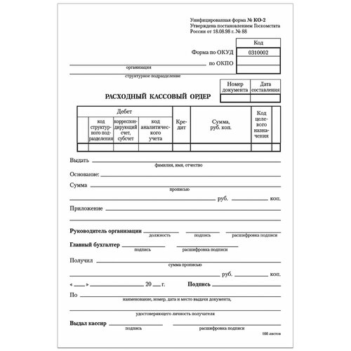 Упаковка 20 шт. Бланк бухгалтерский, офсет, "Расходный кассовый ордер", А5 (135х195 мм), спайка 100 шт, BRAUBERG/STAFF, 130134