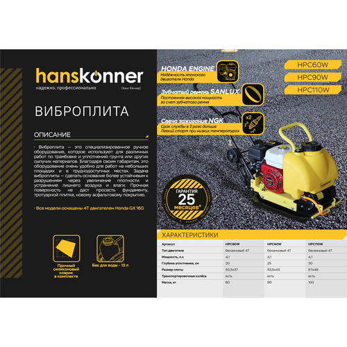 Виброплита оснащена баком для воды, что позволяет использовать ее для уплотнения влажных грунтов. Вес виброплиты составляет 93 кг, что обеспечивает устойчивость и надежность при работе.