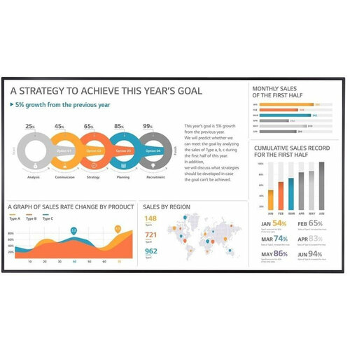 LG 65", Разрешение UHD; Режим работы 24/7; Яркость 500 кд/м2; Коэффициент матовости экрана 28%; ОС webOS 4.1; Wi-Fi; Динамики 10+10 Вт; Режим