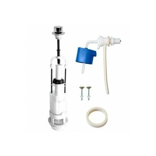 Комплект: наполнительный клапан К 56.00.00 с пластиковым штуцером Присоединительный размер резьбы - G1/2, выпускной клапан К 100.00.00 с пластиковой ручкой и кнопкой цвета "хром", комплект крепежа, прокладка между бачком и унитазом К 100, паспорт-инструкция по установке.