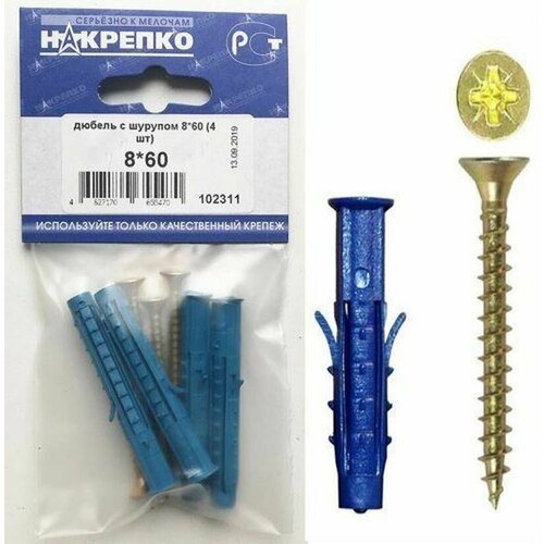 Дюбель с шурупом, Накрепко, 60 х 8 мм, из синего пластика, 4 шт в наборе