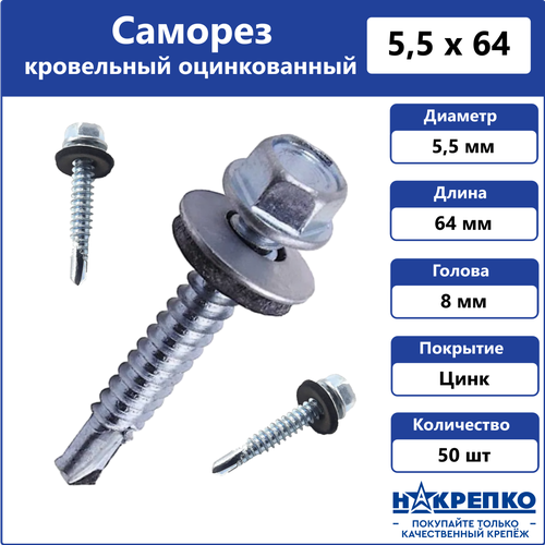 Саморез кровельный по металлу 5,5 х 64 оцинкованный 50 шт Накрепко