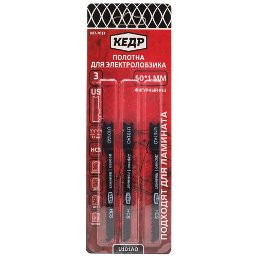 Пилки для лобзика по дереву Кедр U101АО, фигурный рез, 50 мм, шаг 1,3 мм, 3 шт