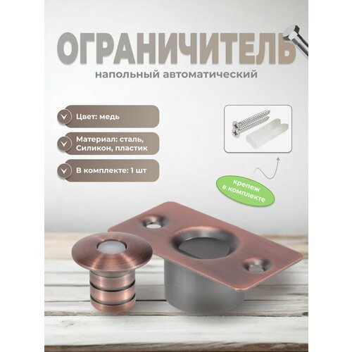 Ограничитель для двери Brante медь, стоппер напольный автоматический, фиксатор двери от удара скрытый, упор металлический с амортизирующим слоем