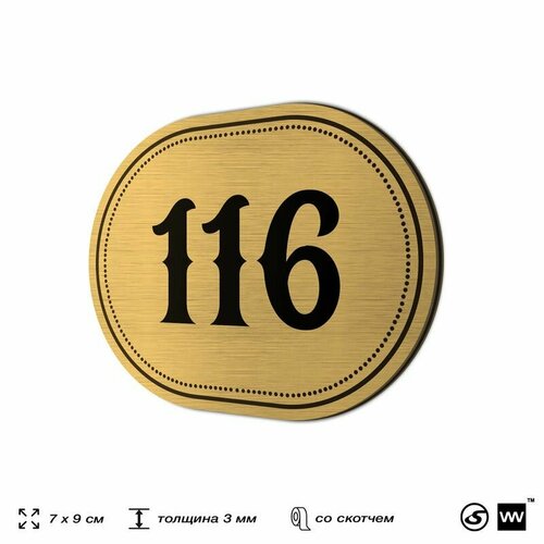 Номерок на дверь квартиры 116, для кабинета, офиса, шильдик 9 х 7 см, золотистый, Айдентика Технолоджи