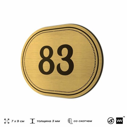 Номерок на дверь квартиры 83, для кабинета, офиса, шильдик 9 х 7 см, золотистый, Айдентика Технолоджи