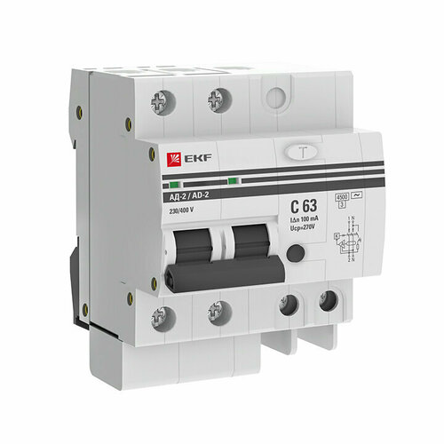 Выключатель автоматический дифференциального тока АД-2 63А 2П двухполюсный характеристика C 4,5kA 100мА тип AC электронный PROxima DA2-63-100-pro EKF