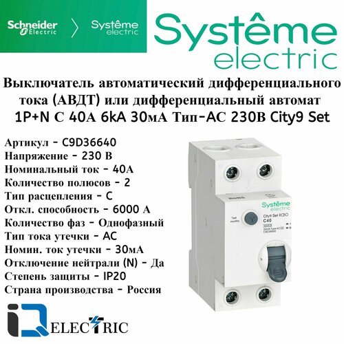 Дифференциальный автомат (АВДТ) 1P+N С 40А 6kA 30мА Тип-AС 230В Systeme Electric City9 Set C9D36640