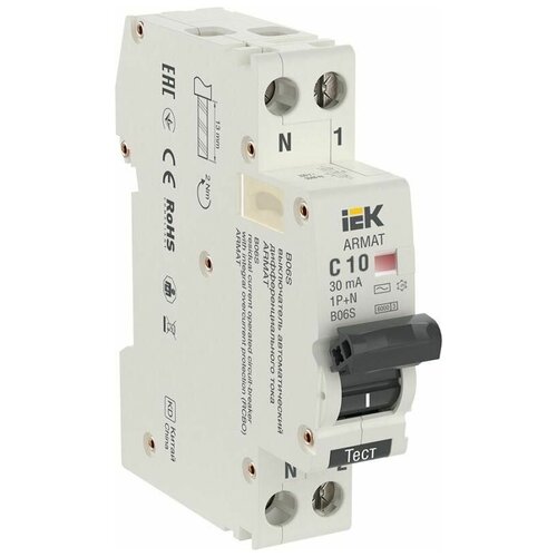 Выключатель автоматический дифференциального тока 2п C 10А 30мА тип AC АВДТ B06S 18мм ARMAT IEK AR-B06S-1N-C10C030