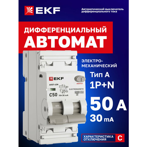 Дифавтомат EKF PROXIMA АВДТ-63N 50А (C) 30мА, тип A, 1P+N (двухполюсный), 6кА, электромеханический