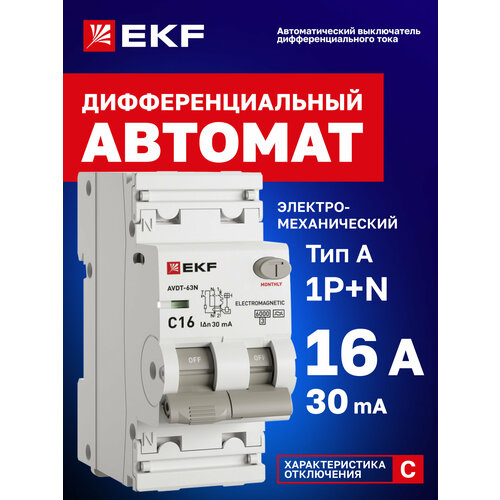 Дифавтомат EKF PROXIMA АВДТ-63N 16А (C) 30мА, тип A, 1P+N (двухполюсный), 6кА, электромеханический